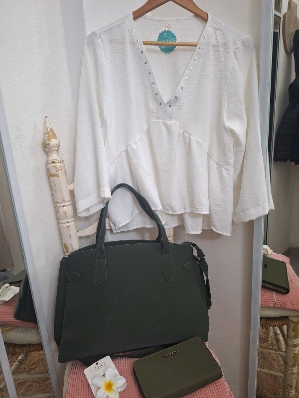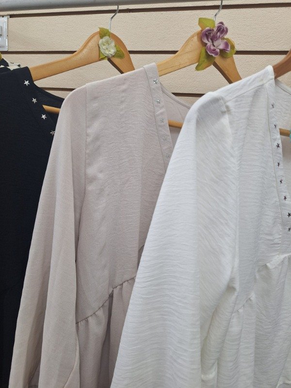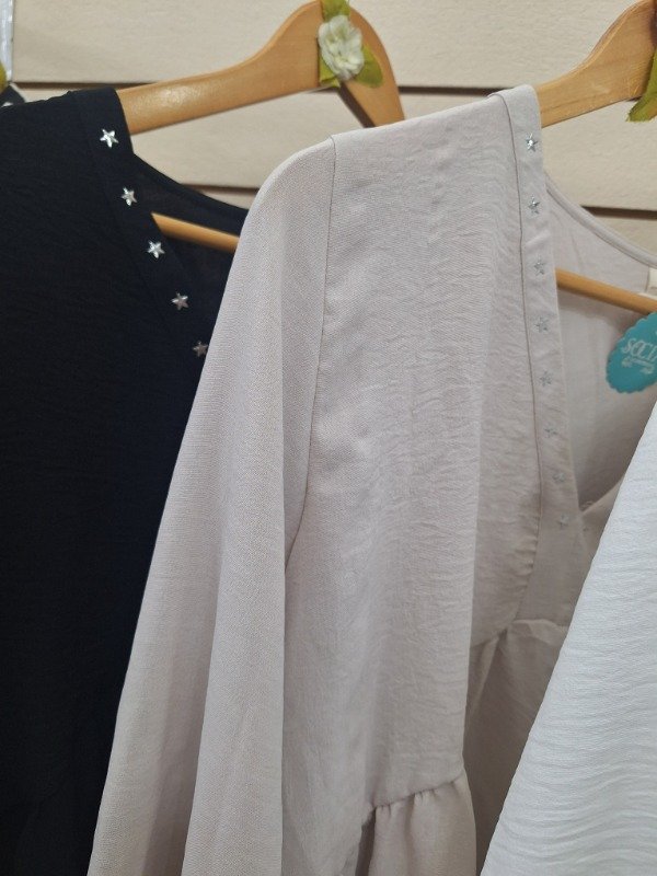 Tiene pequeñas incrustaciones metálicas en forma de estrella a lo largo del escote.